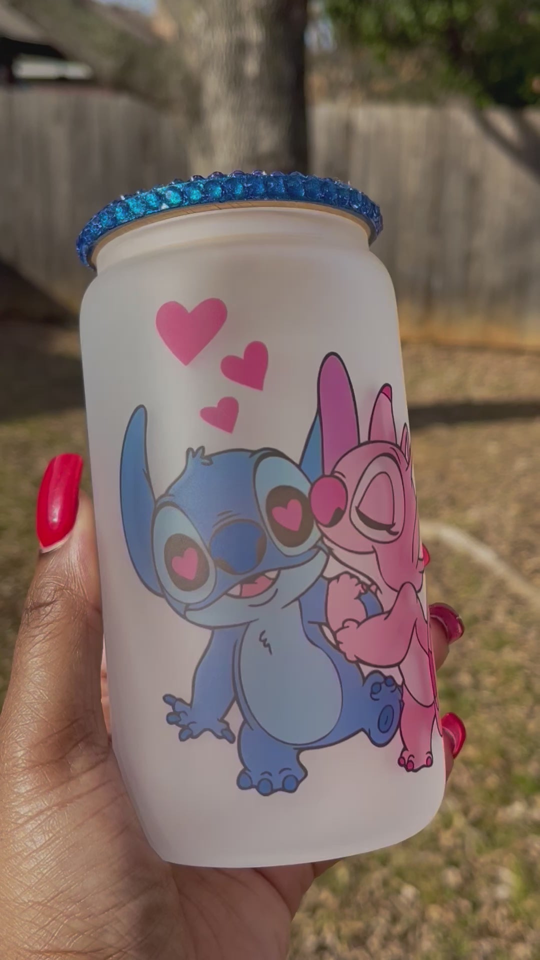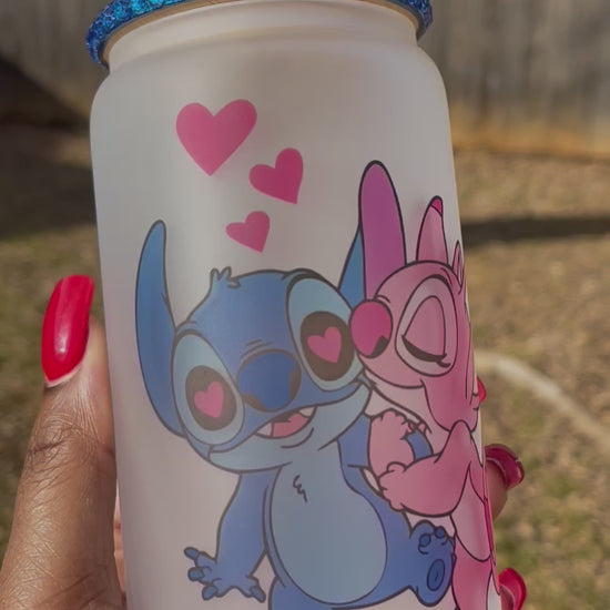Enjoy your favorite hot or cold beverage in this adorable 16 oz glass can featuring Stitch and Angel from Lilo and Stitch.